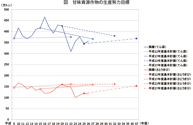 第2回及び第3回基本計画では砂糖の生産努力目標値を引き下げたのだが、それはてん菜の減産によるものであった。計画期間はそれを下回るほど生産が減退しており、今回の基本計画では下がり過ぎた生産量の回復を目指している。さとうきびについても同様に減産した分を回復する計画となっている。過去4回の基本計画では、いずれもほぼ同水準の生産量の生産努力目標を設定している。