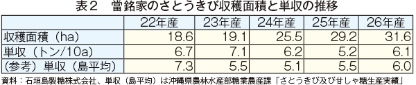 構成員5人はいずれも専業農家で、さとうきびのみを栽培する一人を除き、畜産、でん粉原料用かんしょ、青果用かんしょなどとの複合経営を行っている。さとうきびは、組合全体で20.6ヘクタール(平成26年産)を栽培している。種子島の1戸当たりの平均収穫面積は約1.2ヘクタールであることから、栽培面積と収穫面積の違いはあるものの、構成員一人当たりでは島平均の3倍以上の面積を確保していることになる。