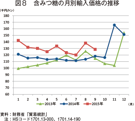 日経POSデータ(全国200店舗)によると、10月の小袋(1キログラム)のスーパーにおける三温糖の平均小売価格は、215.2円(前年同月比0.9円安、前月比2.5円安)であった。