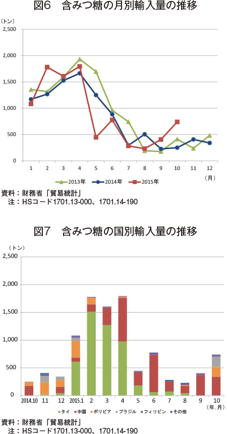 財務省「貿易統計」によると、2015年10月の含みつ糖の輸入量は、740トン(前年同月比3.0倍増、前月比83.2%増)となった(