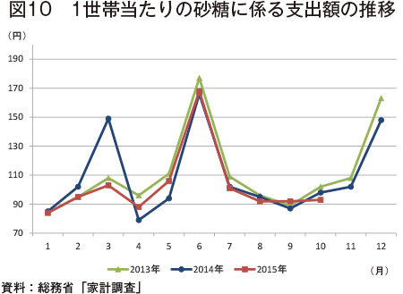 図10)。また、同月の1世帯当たりの砂糖の購入数量は、393グラム(同19.3%減、同4.1%減)となった(