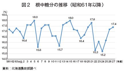 平成27年産てん菜の作付面積は、前年産と比べ1448ヘクタール増加し5万8682ヘクタール、10アール当たり収量は457キログラム増加し6689キログラム(平年比111%)、生産量は35万9000トン増加し392万5000トン(前年比110%)となった。また、平均根中糖分は17.4%と、前年産より0.2ポイント向上し、2年連続で17%を超える高い糖分となった(