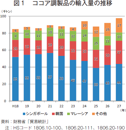 ココア調製品はココア粉、カカオマスおよび砂糖などを混合したものであり、主にチョコレート菓子や飲料などで使用されている。財務省「貿易統計」によると、平成27年の輸入量は9万7645トン(前年比6.2%増)と、前年からかなりの程度増加し、直近10年間で最大となった(