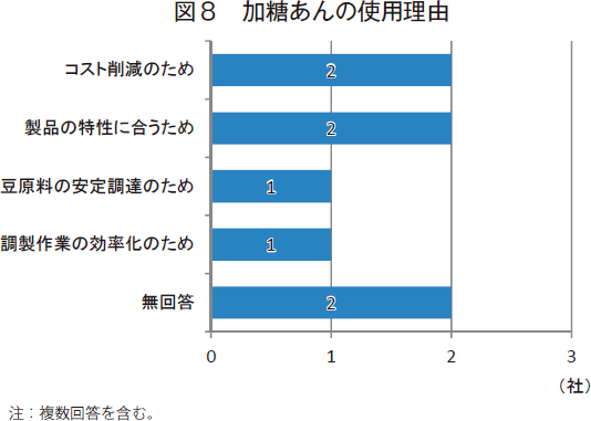 図8)。「豆原料の安定調達のため」と回答した企業の製品分類はパンで、平成27年の仕入れ量が1万トンを超えており、調査対象企業の中で最も仕入れ量の多い企業であった。