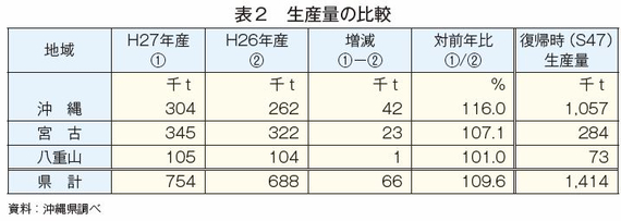 なお、各地域別生産量では、沖縄地域(周辺離島を含む)が全体の40.4%、宮古地域が45.7%、八重山地域が13.9%となっている。