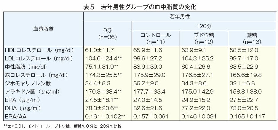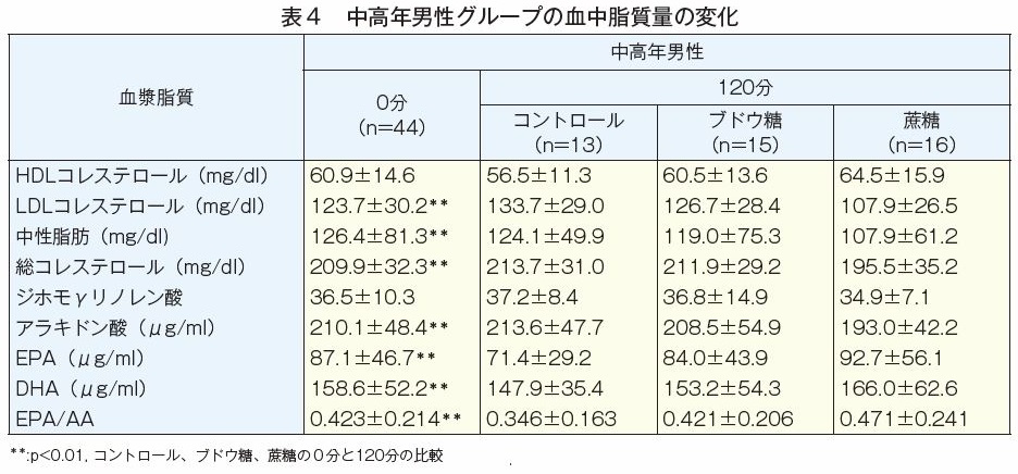 ブドウ糖、蔗糖を摂取する前の血漿中のLDLコレステロール、中性脂肪および総コレステロールの値は、中高年男性グループの方が若年男性グループよりも有意に高かった(表4、表5)。また、ωアミノ酸であるアラキドン酸、DHA(ドコサヘキサエン酸)、EPA(エイコサペンタエン酸)の値も中高年男性グループの方が若年男性グループより高かった。