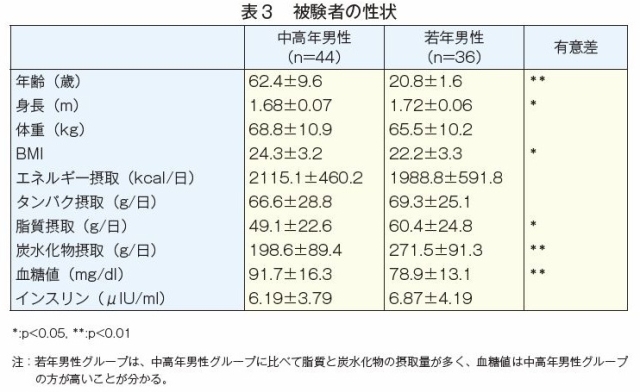 われわれは、被験者を中高年男性と若年男性の2つのグループに分け、ブドウ糖、蔗糖を摂取させ、血中の脂質とアミノ酸の変動を調べた。被験者の性状は表3の通りである。