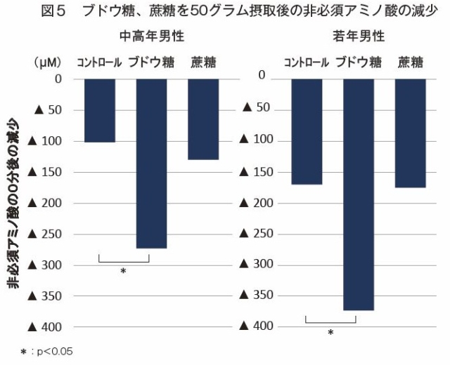 ブドウ糖を摂取した際に若年男性グループでは、非必須アミノ酸量が有意に低下したが蔗糖の摂取後にはあまり変化が見られなかった(図5)。