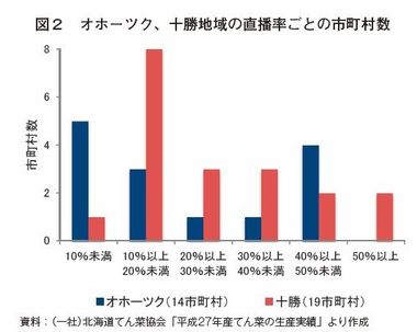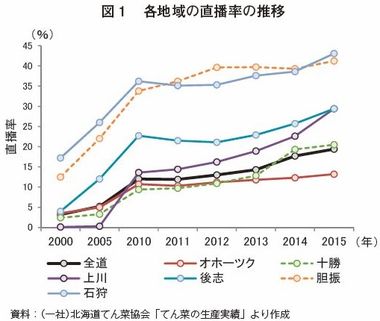 図1)。特に2010年以降、上川地域、後志地域や主産地の十勝地域で直播率が大きく伸びている。一方、もう一つの主産地のオホーツク地域では、まだそれほど伸びが大きくないものの、市町村ごとに見ると直播率が40%を超えているところがかなり存在している(