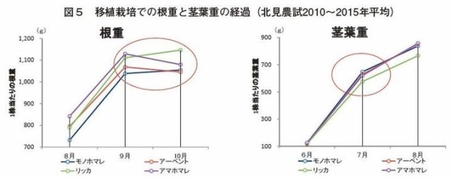 根重は、移植栽培では「リッカ」は最後まで上昇したのに対し、「アマホマレ」は9月以降伸びが止まり停滞した(