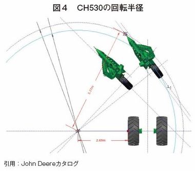 CH530は、2016 年からCH330の後継機として製造・販売が始まった機種である。メーカーとしては、大型機CH3520に匹敵する作業性能と中型機CH330の機動性を併せ持った機種を目指してモデルチェンジを行っている。CH330からの大きな変更点は、クロップディバイダや掻き込み口の作用幅を拡大し、高単収や2条植え(寄せ植え)のサトウキビへの適応性を高めたところである。このため、エンジンの出力を148キロワットから152キロワットへアップし、輪距を10センチメートル拡大するとともにタイヤ幅(後輪)を52センチメートルから60センチメートルと大きくして作業の安定性を向上させている。基本的な設計はCH330同様、CH3520の設計コンセプトを踏襲し、多くの部品を共通化して、導入やメンテナンスのコスト低減を図っている。前折れ式操舵システム(写真17)、フルタイム4WDをはじめ、大部分の操作を運転席右側のマルチファンクションレバーに集約していることや、コーナーポストディスプレイ、タッチパネルディスプレイによる風量、刈り高さなどの作業コントロールやインフォメーション表示機能などはCH330と同じである。