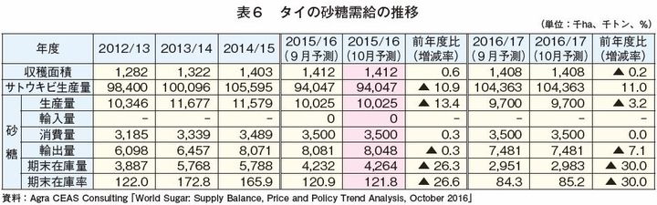 (注3)ブラジル政府は、タイ政府が、国際砂糖価格の低迷時などに製糖企業を通じて生産者に支払われる補てん金や、砂糖の販売割当制度および国内販売価格の設定は、間接的な輸出補助金に当たり国際貿易協定に違反しているとして、4月初旬にWTOに提訴していた。