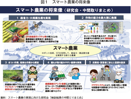 (注)を活用した超省力生産、高品質生産を実現する新たな農業」と定義されており、GPSを活用した自動走行システムやセンシング技術を活用した作物の精密管理、アシストスーツによる軽労化、除草ロボットなどによる自動化、作業ノウハウのデータ化など、大変幅広い内容が含まれている(