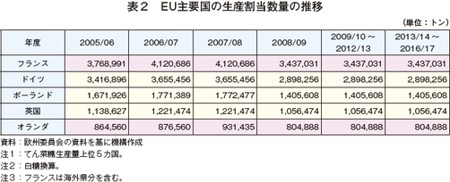 (注)2005年のWTOの裁定により、輸出量を137万4000トンに制限されたことなどから、EU域内の砂糖の生産割当を2009/10年度までに600万トン削減することを目標に行われた改革。この改革以降、生産割当数量を超過した砂糖については、一定の要件を満たさないと余剰課徴金が課せられることとなったほか、生産割当を放棄する製糖企業に対し再構築助成金が支払われたこともあり、てん菜糖生産の集約化が進んだ。砂糖の生産割当は、2017年9月末に廃止されることとなっている。詳細は、丸吉裕子、根岸淑恵「英国の砂糖産業の動向〜EUの砂糖生産割当廃止の影響を中心に〜」『砂糖類・でん粉情報』(2017年3月号)を参照されたい。