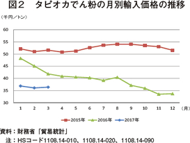 財務省「貿易統計」によると、2017年3月のデキストリンの輸入量は、1010トン(前年同月比16.8%増、前月比31.6%減)と、前年同月から大幅に増加したものの前月からは大幅に減少した(