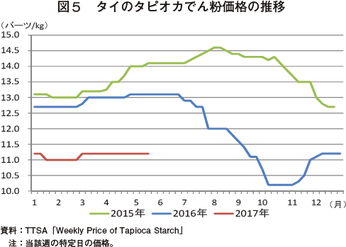 キャッサバの供給動向を見ると、中央高原地域では、2月の前半はタピオカチップの乾燥に適さない不安定な気象条件だったため、多くがでん粉用に仕向けられたが、その後天候が回復したため、タピオカチップ向けが増加し、でん粉向けが減少した。一方、タイニンでは、2月の中旬から収穫が始まったものの、まだ収穫量は少なくでん粉含量もかなり低いことから、同地域のでん粉工場は、主にカンボジアから原料を輸入している。カンボジアは、2月がキャッサバ収穫の最盛期であることから、タイニンへのキャッサバの輸出が急増している。