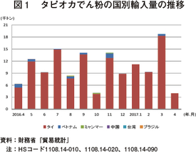 デキストリンの輸入先国は10カ国で、デキストリンの輸入量は、上位輸入先国の数量および各国のシェアも含め、月ごとの変動が大きい。上位輸入先国からの輸入量は次の通りで、タイが輸入量の6割以上を占め、次いでベトナム、フランスとなっている。