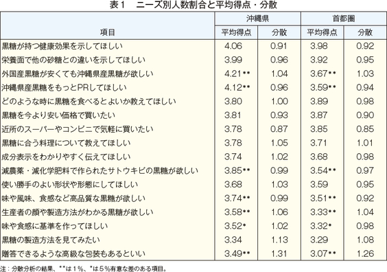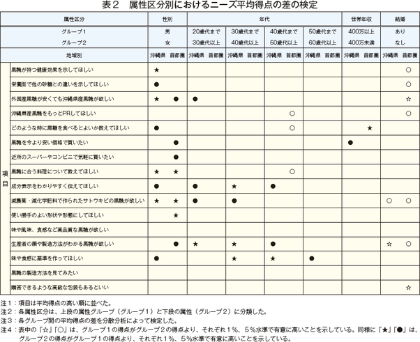 このように、16項目でさまざまな相関を示していることから、さらに潜在的な意識を発見するために、因子分析を用いて分析した。第1因子で因子負荷量の高い項目は、「生産者の顔や製造方法がわかる黒糖が欲しい」「減農薬・減化学肥料で作られたサトウキビの黒糖が欲しい」「外国産黒糖が安くても沖縄県産黒糖が欲しい」「味や風味、食感など高品質な黒糖が欲しい」「味や食感に基準を作ってほしい」「贈答できるような高級な包装もあるといい」「沖縄県産黒糖をもっとPRしてほしい」「黒糖の製造方法を見てみたい」であり、安心・安全や品質の良さを求めていることから、「安心・品質ニーズ」とした。
