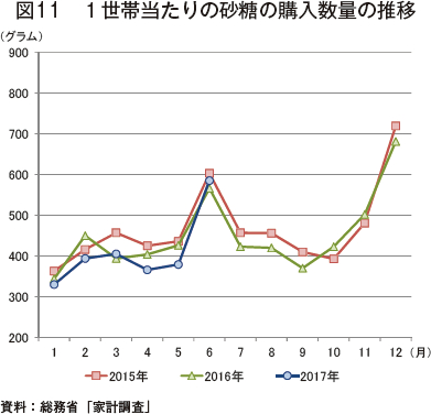 図10)。また、同月の1世帯当たりの砂糖の購入数量は、585グラム(同3.4%増、同54.4%増)であった(