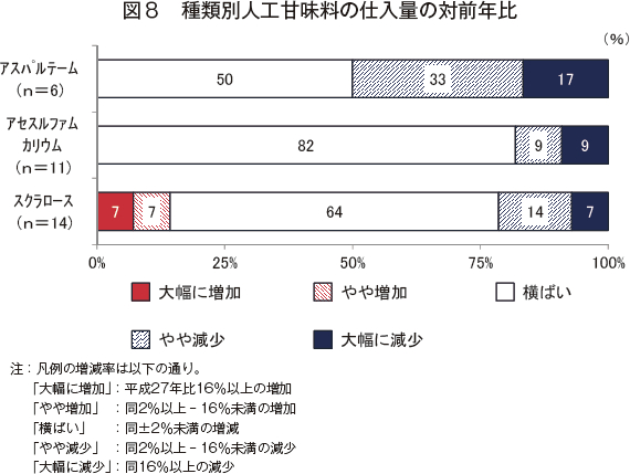 平成27年と比較した28年の仕入量の動向は、アスパルテームを除き、「横ばい」が過半を占めた(