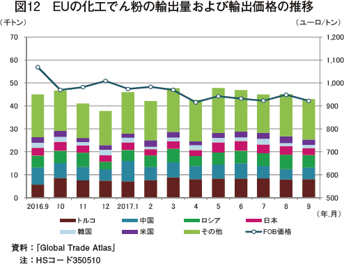 コラム 中国のばれいしょおよびばれいしょでん粉生産動向について2017年9月15日、中国商務部はEU産ばれいしょでん粉に対する相殺関税(7.5%〜12.4%)を翌16日から5年間延長することを発表した。これは、相殺関税を課さないと、国内産業が被害を受けると商務部が判断したためである。そこで今回は、中国におけるばれいしょおよびばれいしょでん粉生産動向について紹介する。1.ばれいしょ 近年のばれいしょ生産量は、2013年をピークに減少傾向で推移しているものの、世界の約2割を占める世界最大のばれいしょ生産国である(図1)。ただし、種いもの品質が高くないことや、病害の発生などにより、収量はそれほど多くないとされる。 生産されたばれいしょの約6割が家庭やレストランなどで生食用として利用される。次いで、飼料用で約2割、でん粉を含む加工用で1割強などとなっている。