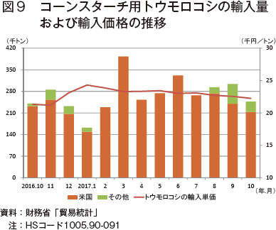 2017年10月の1トン当たりの輸入価格は、8万6772円(前年同月比5.9%高、前月比22.4%安) と、前月から大幅に下落した。