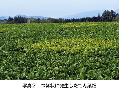 写真1)。てん菜の畑では、黄化症状が数株から数十株単位でスポット状に発生する場合が多い(