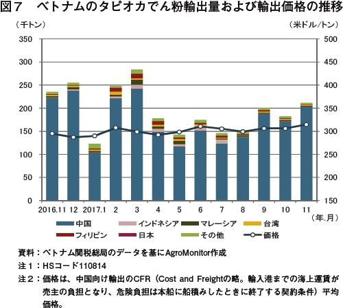 一方南部のタイニン省では、モザイク病に感染し、キャッサバを除去した地域があることに加え、長雨により大量のキャッサバが腐ったことにより、今期の収穫量は前年と比べて40%以上減少すると見込まれているため、同省におけるキャッサバ供給量は落ち込むとみられる。このため同省のでん粉工場はカンボジアや中央高原地域からもキャッサバを調達すると見込まれている。カンボジアでは、今期のキャッサバ収穫量が多いが、ベトナム向けキャッサバ価格が前年と比べて約50%高いことから、農家はタピオカチップではなく、キャッサバ(いも)を販売する傾向にある。