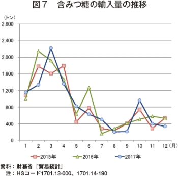 総務省「家計調査」によると、2017年12月における100世帯当たりの砂糖の購入頻度は56で、1世帯(2人以上)当たりの支出金額は、138円(前年同月比7.4%安、前月比39.4%高)であった(