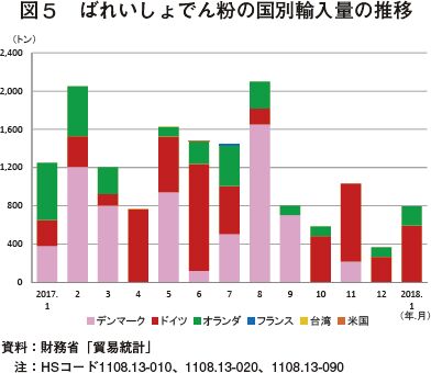 デキストリンの輸入先国は7カ国で、デキストリンの輸入量は、上位輸入先国の数量および各国のシェアも含め、月ごとの変動が大きい。