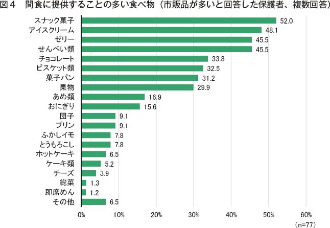 図3)。市販品が多いと回答した保護者がよく与える間食としては、スナック菓子、アイスクリーム、ゼリー、せんべい類が上位にあげられた(