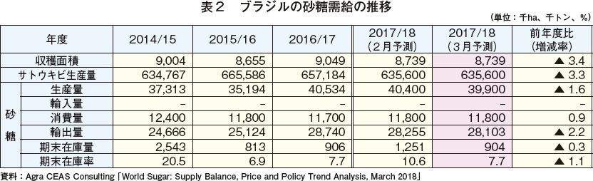 (注3)政府は2017年8月23日、エタノール輸入に対し、年間60万キロリットル(四半期ごとに15万キロリットル)の無税の関税割当を設けるとともに、これを超過して輸入されるエタノールに対しては20%の関税を課すことを決定した。同関税は、エタノール在庫量の低下に伴い2010年に停止して以来の再導入で、2年間実施された後、見直しが予定されていた。同措置は、国内のエタノール生産量の減少やトウモロコシの国際価格の下落などにより米国からのトウモロコシ由来のエタノール輸入量が急増している状況を受け、UNICAや北東部の砂糖・エタノール製造企業などが、以前から政府へ実施を要請していたものである。