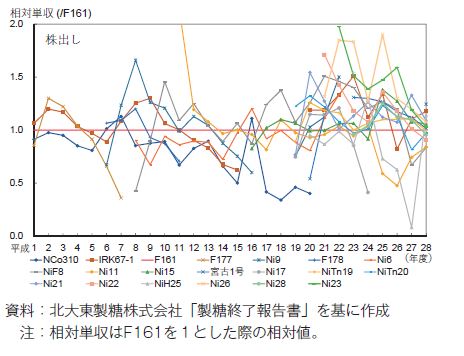 図3右下)。F161以外のすべての品種の相対単収を平均し、その推移を見ると、20年以降、株出し栽培の単収が高かった(