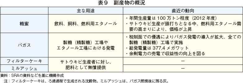 なお、サトウキビの製糖工程で得られる糖蜜やバガスといった副産物は、さまざまな用途に用いられている。バイオ燃料法(2006年成立)や再生可能エネルギー法(2008年成立)といった法整備の進展による後押しもあり、利用は拡大基調にある(表9)。
