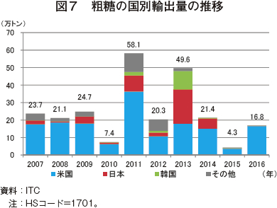 なお、精製糖の輸出量は、近年1000トン前後で推移してきたが、2007年には7000トン余り、2016年はわずか21トンと、国内の需給動向に大きく左右される。