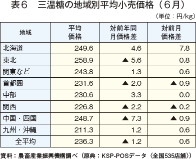 KSP−POSデータ(全国535店舗)によると、スーパーにおける6月の上白糖小袋(1キログラム)の平均小売価格は、193.5円(前年同月差0.3円高、前月差1.1円安)であった。