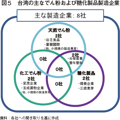 このように、台湾のでん粉生産は非常に限定的であり、多くは製品となった状態での輸入に頼っている。こうした状況から、でん粉生産量に関する統計が存在せず、でん粉の消費に関する統計も公表されていない。なお、でん粉消費量の調査を行っている財団法人中華穀類食品工業技術研究所によると、近年の天然でん粉に対する需要は横ばいであるという。