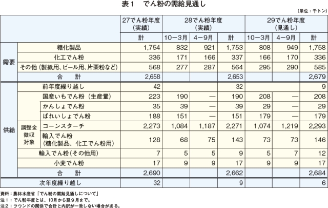 農林水産省は、「砂糖及びでん粉の価格調整に関する法律」(昭和40年法律第109号)により、でん粉に関して適切な価格調整を図るため、半期ごとにでん粉の需給見通しを公表している。3月に公表したでん粉の需給見通しの概要は、次の通り(