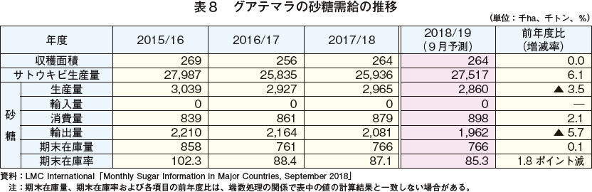 砂糖生産量は、サトウキビ生産量の減少を受け、1513万トン(同2.9%減)とわずかな減少が見込まれているが、国内消費を上回る生産が続いていることから、輸出量は、1364万トン(同32.6%増)と2年度連続の大幅な増加が見込まれている。この結果、2017/18年度に大幅に増加した期末在庫については、2018/19年度は大幅に減少し、例年並みの水準に戻ると見込まれている。