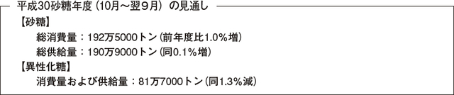 農林水産省は、「砂糖及びでん粉の価格調整に関する法律」(昭和40年法律第109号)により、四半期ごとに砂糖および異性化糖の需給見通しを公表している。9月に「平成30砂糖年度における砂糖及び異性化糖の需給見通し(第1回)」を公表した。