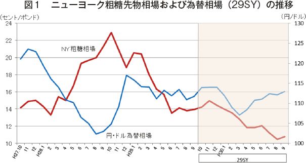 ニューヨーク粗糖先物相場(期近)は、平成28年10月に1ポンド当たり23セント台を記録した後、世界的な供給過剰感を背景に弱含みで推移し、翌9月には同13セント台まで下落した。29SYにおいても、砂糖生産国であるインド、タイ、EUにおける生産量が前年度よりも増加した影響などにより、下落傾向で推移した。