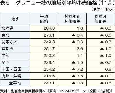 KSP−POSデータ(全国535店舗)によると、スーパーにおける11月のグラニュー糖小袋(1キログラム)の平均小売価格は、243.1円(前年同月差0.8円安、前月差0.6円安)であった。
