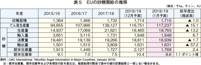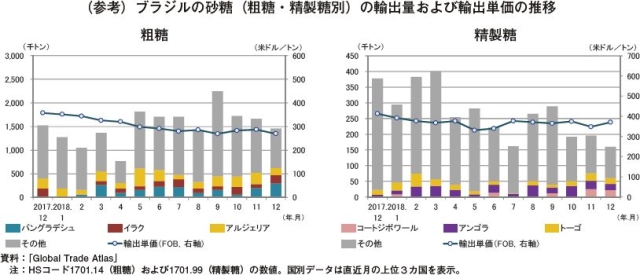 表2)。砂糖生産量は、サトウキビの減産に加え、砂糖価格よりエタノール価格が高く推移し、サトウキビをバイオエタノール生産に仕向ける動きが加速すると予測されるため、3105万トン(同25.2%減)と大幅な減少が見込まれている。輸出量は、主要輸出相手国である中国が追加関税措置を実施していることなども影響して、1984万トン(同36.0%減)と大幅な減少が見込まれている。