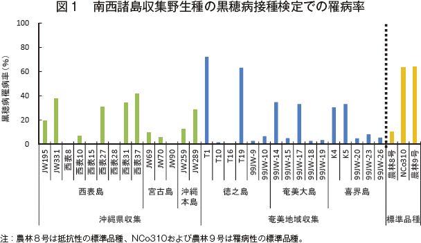 図1で示すように、南西諸島に自生する野生種群には接種検定による黒穂病罹病率に大きな差異が認められた。また、西表島や徳之島などで収集した野生種は、収集地域が近い場合でも野生種間で抵抗性程度に大きな違いがみられた。