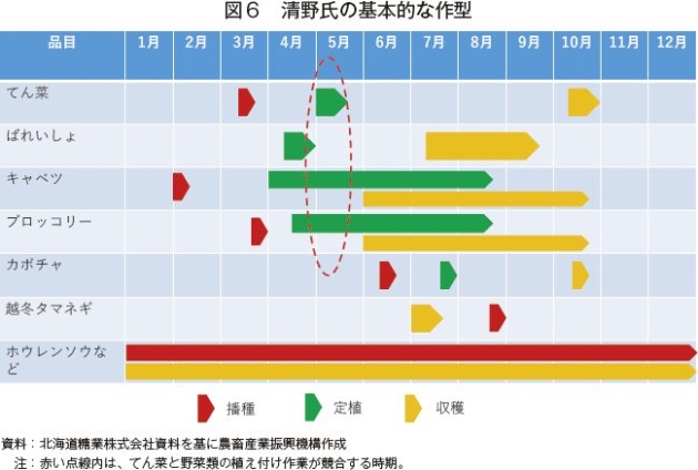 清野氏は、元々てん菜と野菜を作っていたが、てん菜の定植作業について、ばれいしょや野菜の植え付け作業と競合して、天候によってはてん菜の定植が遅くなってしまうことがあったという(図6)。キャベツやブロッコリーは、収穫の時期に合わせて、定植の時期を1週間ごとなどでずらしており、てん菜の定植と重なった場合は、てん菜の定植をストップせざるを得なかったという。てん菜の定植が遅れると収量が低下することから、定植を遅らせることなく作業を行いたいという考えがあった。また、清野氏は、てん菜、ばれいしょ、野菜・緑肥の順番で輪作を行う中、一部自宅から離れた圃場でも作付をしており、平成30年、離れた圃場でのてん菜作付をきっかけとして、ホクイーへ農作業委託を行うことになった。