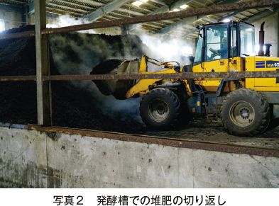写真1)。堆肥化は、主に好気性微生物により行われるため、通気性および水分量を適切に保つことが重要であり、約70%が適切な水分量の目安と言われている。梅雨時期の降雨の影響については、現状では初期工程が多少遅れる程度で大きな問題にはならないとのことである。