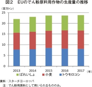 EUで生産されるでん粉原料用作物は、前述の通り、主にばれいしょ、小麦およびトウモロコシである。でん粉原料用作物の変化を見てみると、直近5年間は、大きな増減はなく安定的に推移している(図2)。