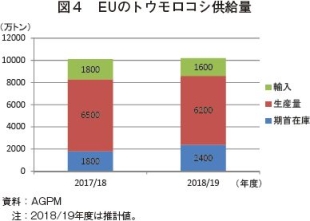 EUにおけるトウモロコシ(でん粉原料以外の用途のものを含む)作付面積の推移を見てみると、ここ数年で減少傾向にある(図3)。2018/19年度(2018年10月〜翌9月)の生産量が減少しているのは2018年に発生した干ばつの影響とみられ、前年比4.6%減の6200万トンとなったものの、同年度の期首在庫が豊富にあったことから、供給量全体はわずかに増加している(図4)。
