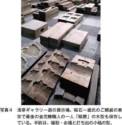 金花糖の木型を保存されている稲石一雄氏は、現在、「浅草ギャラリー遊」(東京都台東区西浅草)を運営されている(写真4)。今は廃業されているが、昭和38年くらいまで金花糖を製造していたという。西浅草3丁目はかつて浅草芝崎町と呼ばれ、昭和40年代には74軒の菓子屋のうち金花糖を作っている店が8軒ある「菓子屋横丁」だった。博覧会では、木型とパネルが展示され、木型の横に、鈴木氏が糖液を流し込んで作った金花糖が並んだ(写真5)。