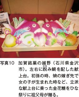 形は出展者によってさまざまだが、結婚式の引き出物としてかつてよく使われた鯛(写真2)と、招き猫(写真3)の形が多い。金花糖は、現在では、ひな祭りの添え菓子のほかに、冠婚葬祭のお菓子として売られている。新潟では2月25日に行われる「天神講」(注)の砂糖菓子として有名だ。また、石川県小松市では、初詣と春と秋のお祭りに、生鯛に代わって、30センチメートルの金花糖の鯛を奉納する神社が多く、家庭では、12センチメートルの小さな金花糖の鯛を神棚に供える。